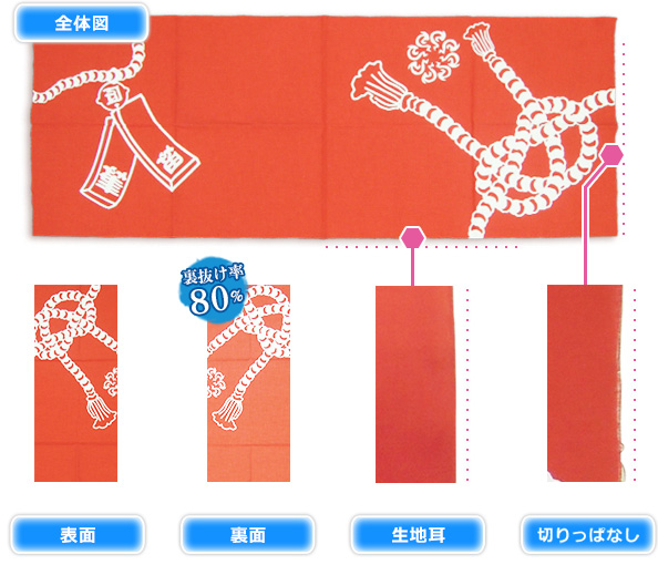 反応染めにて印刷され、製作されたオリジナル手ぬぐいは、大体80%程度と言われる裏抜け率で仕上がります。しかしこれは、あくまで目安であり、デザイン性を重視された場合は低下致しますので、最大値であるとお考え頂けましたら幸いです。
